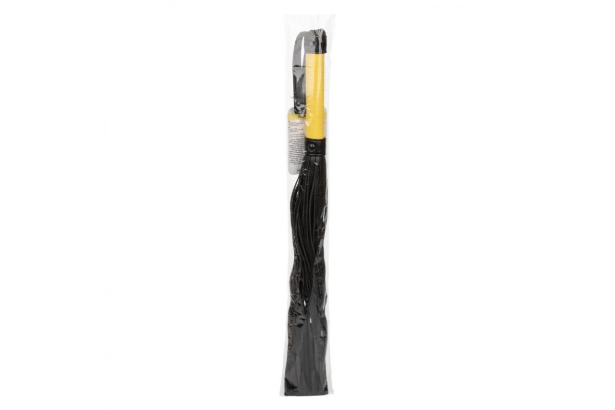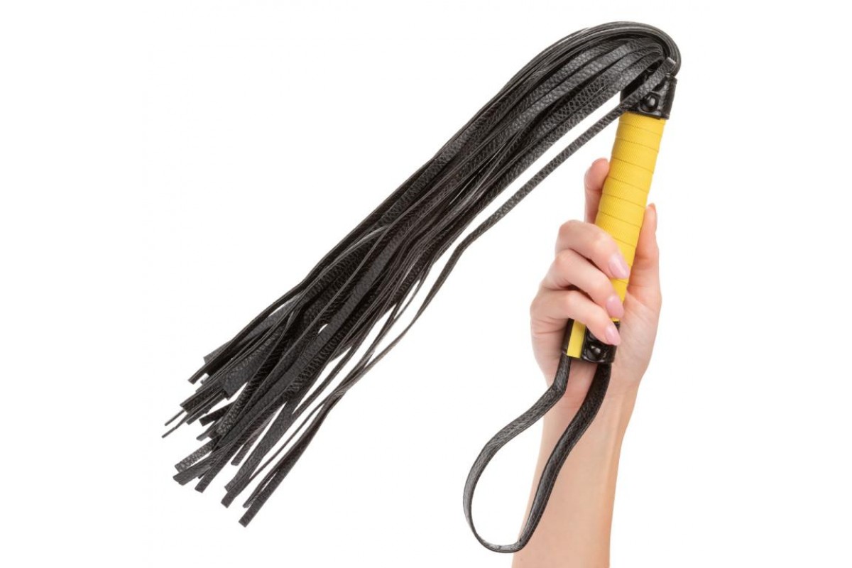 Многохвостая гладкая плеть Boundless Flogger – универсальный ударный девайс для эротических ролевых игр и практик БДСМ. Флогер относится к мягкому типу. Он состоит из прочной рукояти желтого цвета, удобной черной кожаной петли для фиксации изделия на запястье (темляк) и множества «хвостов», нарезанных из тонких полос, соединенных между собой черными металлическими заклепками. Длина хвостов - 37,5 см.