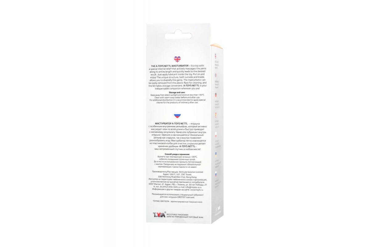 Мастурбатор A-Toys Nettl – игрушка с особенным внутренним рельефом, который активно массирует член по всей длине и быстро приводит к желаемому результату. Нанесите лубрикант внутрь игрушки. Оденьте и наслаждайтесь! Уникальный рельеф как снаружи, так и внутри позволяет разнообразить игру. Мастурбатор легко извлекается из пластиковой колбы для очистки, а крышка делает хранение удобным. A-Toys Nettl - ваш непременный спутник в любом месте! Рабочая длина - 15 см.