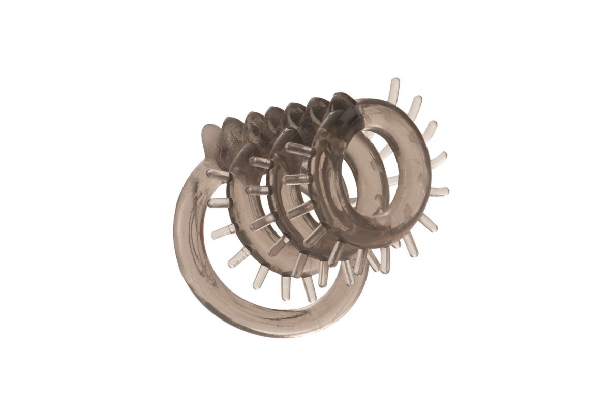 Дымчатый хомут на пенис из тянущегося и упругого материала. Все 4 кольца одеваются на пенис, через большее продевается мошонка, а три стимулирующих кольца на стволе пениса предназначены для поддержки эрекции и дополнительной стимуляции партнерши.