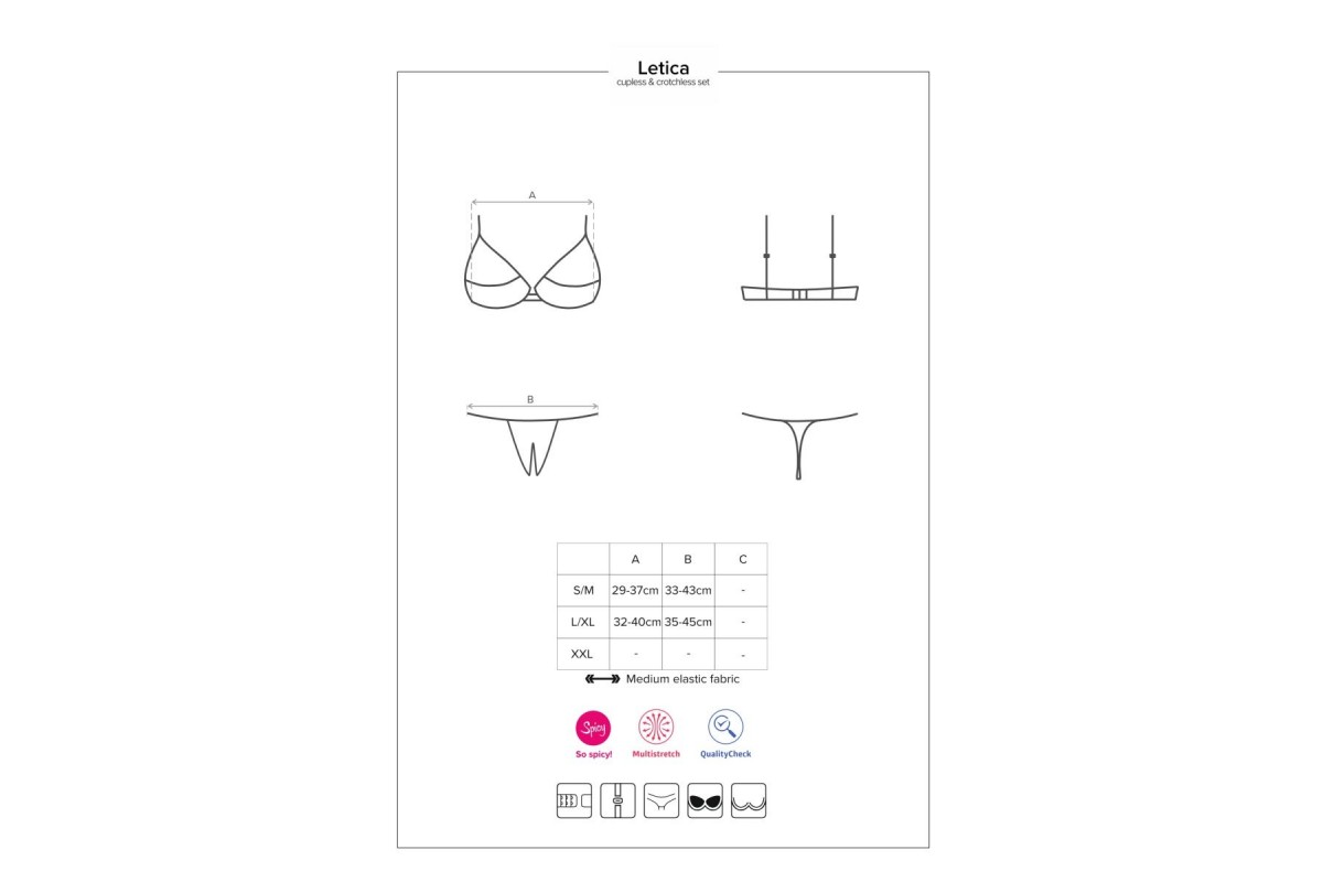 Откровенный кружевной комплект белья, состоящий из двух предметов. Бюстгальтер с открытыми формованными чашечками на косточках великолепно поддерживает грудь. Украшение в виде атласного бантика и подвески со стразами привлекают внимание к зоне декольте. Сзади застежка на крючки, бретели регулируются по длине. Трусики-стринги с открытой промежностью добавляют комплекту еще большей пикантности. В комплекте: бюстгальтер и трусики-стринги.