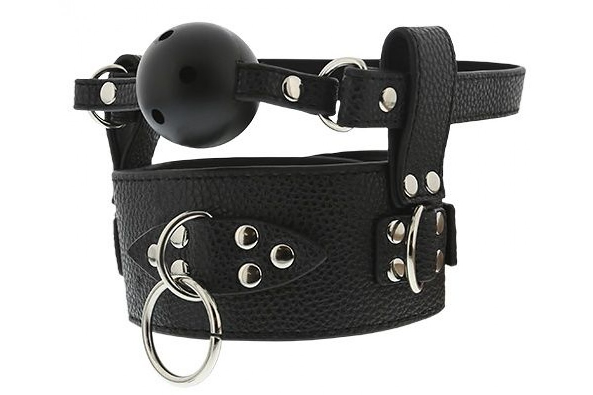 Ошейник с 2 металлическими D-кольцами, уплотнительным кольцом, заклепками и кляпом-шариком для рта. Размер ошейника можно регулировать с помощью металлической застежки. Гладкий шарик-кляп не имеет вкуса и запаха и является безопасным при использовании.