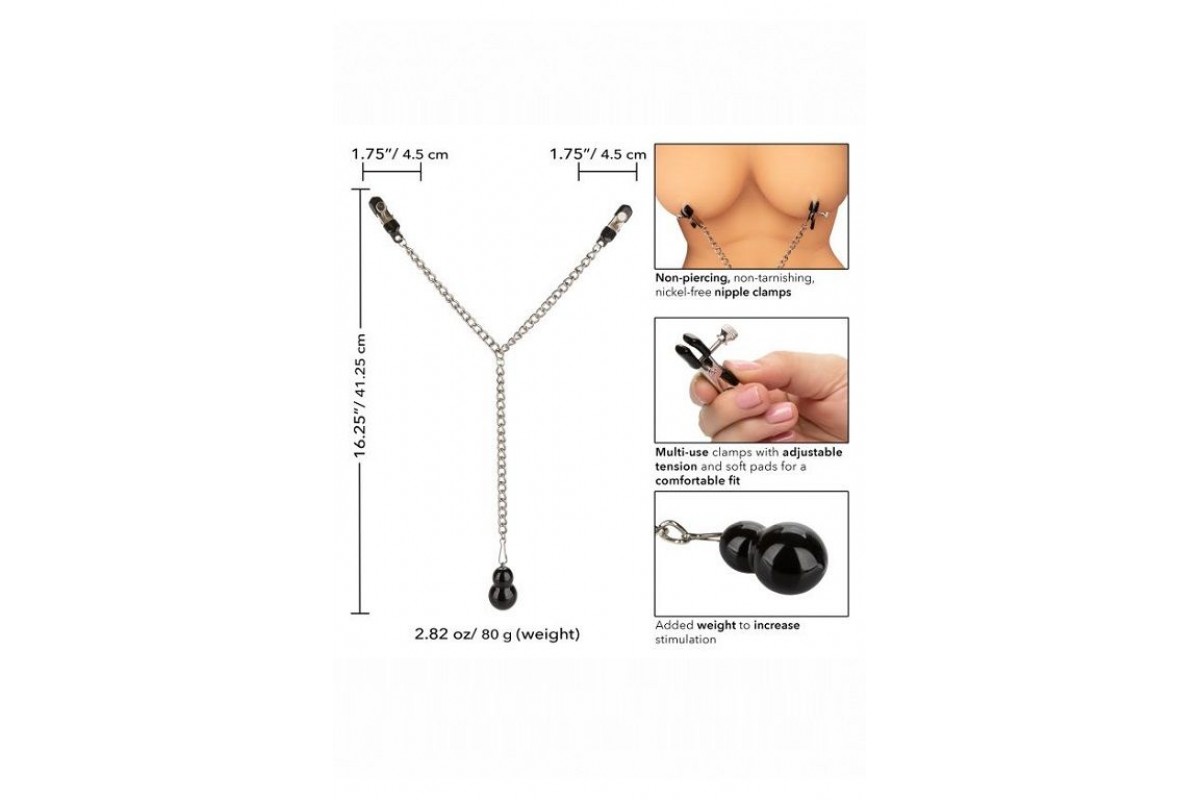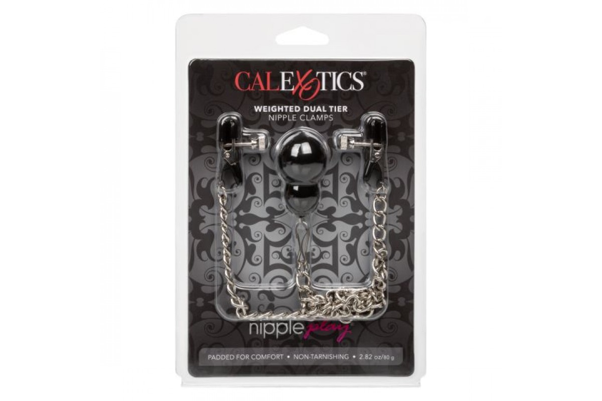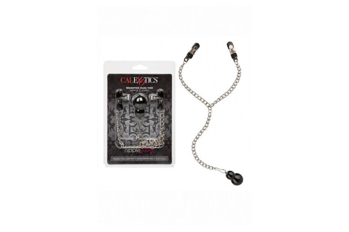 Weighted Dual Tier Nipple Clamps - регулируемые двухуровневые зажимы на соски в виде прищепок и с утяжелителем. Цепочка и зажимы изготовлены из железа. Кончики зажимов оснащены мягкими, удобными подушечками из поливинилхлорида. Силу их сжатия можно регулировать при помощи специальных винтов. Зажимы декорированы изящной декоративной подвеской. Зажимы предназначены не только для украшения, но и стимуляции одной из самых эрогенных зон на теле человека, для интимного возбуждения, а также для длительной эротической игры. Под воздействием давления соски становятся более восприимчивыми к ласкам. Помимо сжатия, добавленный вес увеличивает чувственную стимуляцию и усиливает чувствительность сосков. Длина зажима - 4,5 см.