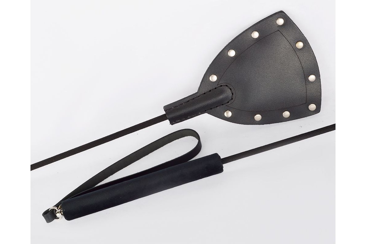 Стек состоит из жесткой рукояти, гибкого полимерного хлыста и хлопушки из натуральной кожи.