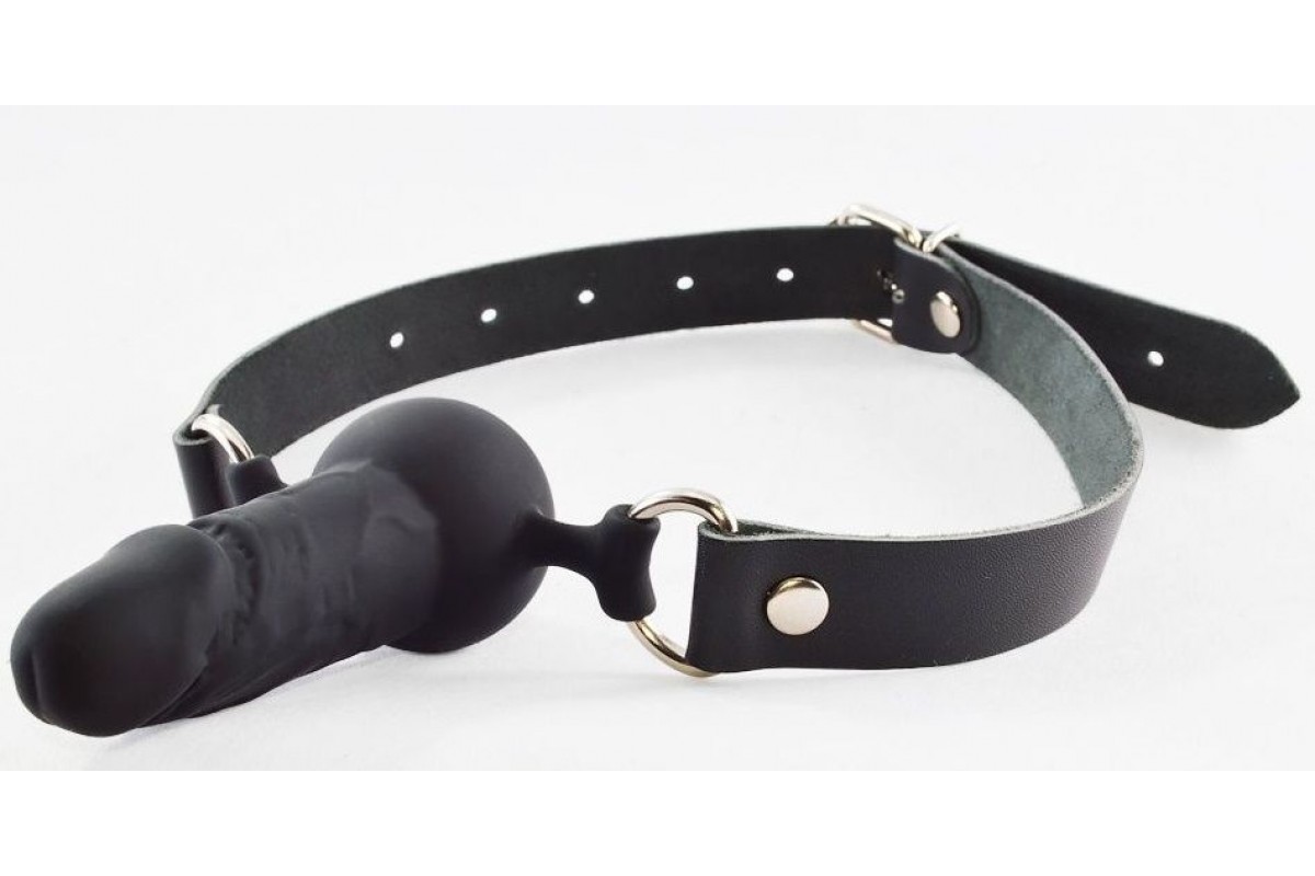 Силиконовый кляп в виде сферы и небольшого фаллоимитатора прикреплен к ремешкам из натуральной кожи. Регулируется кляп при помощи металлической пряжки. Металлическая фурнитура имеет никелевое покрытие. Ширина ремешков - 2 см. Длина кляпа - 9,7 см. Диаметр шара - 3,8 см.